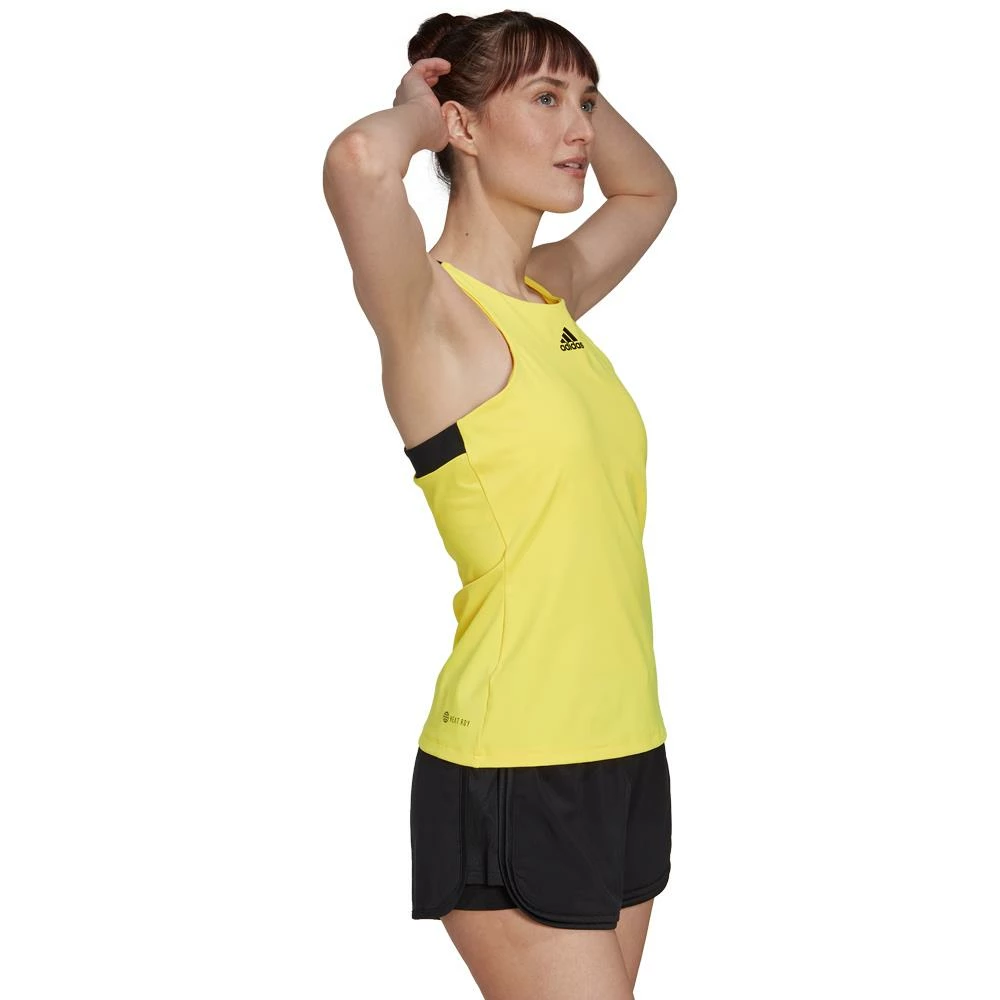 Cool yellow on a great tennis tank. Take your game higher in this slim-fitting adidas tennis tank top. Part of a Gameset collection filled with on-court essentials, it has a soft Y-elastic strap that gives your shoulders plenty of room to wind up for shots. HEAT.RDY keeps you fresh on the hottest days so you can play your all-action game without wilting. The integrated bra adds comfort and confidence.